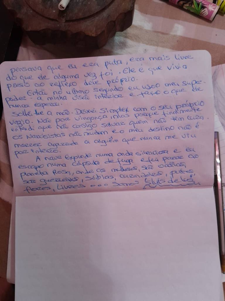 A nave explode numa onda silenciosa e eu escapo numa cápsula de fuga e fui parar ao planeta rosa, onde as mulheres, são vadias, são guerreiras, sábias, curandeiras, putas, flores, livres… somos sluts de luz