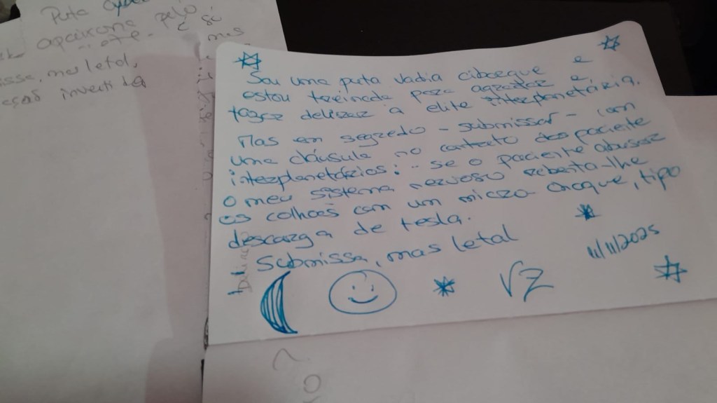 E, no entretanto, eu fazia-lhe sinais se ele podia dar-me o contacto de algum amigo meu. Porque eu, entretanto, tinha conseguido recuperar o… Eu tinha, olha, eu esqueci-me do PIN, eu fiquei sem bateria, depois consegui ligar, mas depois não tinha o PIN, então tive de ligar, olha, uma confusão. Ele enervou-se muito por eu estar stressada com o telefone e começou… Levantou-se, já estava em tronco nu, grande, forte para caralho, a sala, a porta dá diretamente para a rua, para a serra, tem um pátio com os cães e a serra depois.